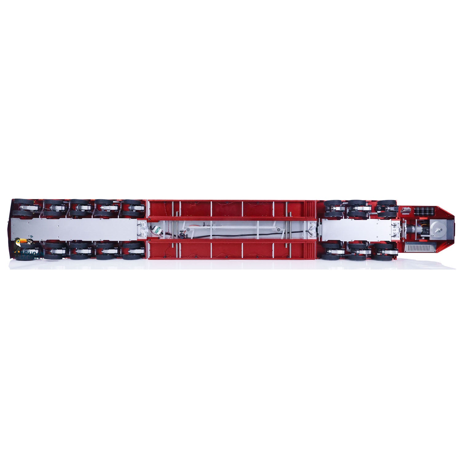 7. It is recommended to use three 2s (7.4v) 1800-3000mAh 25c lithium batteries (with JST connectors) for the gooseneck, three-axle trailer, and five-axle trailer (Batteries are not included). The dimensions of the battery compartments are: gooseneck- 80*50*50mm, three-axle trailer- 70*50*10mm, five-axle trailer- 80*50*20mm.